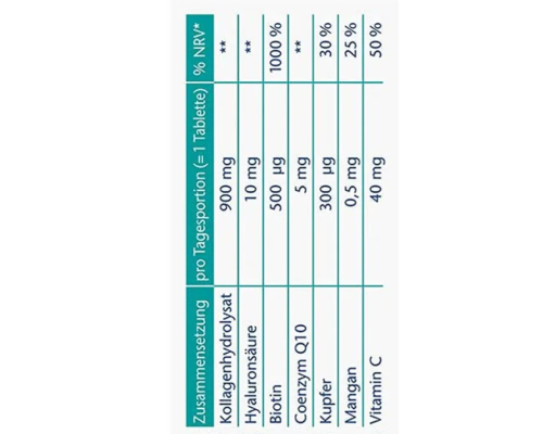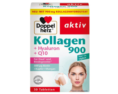 Doppelherz 膠原蛋白 900 片含有 900 毫克膠原蛋白水解物和 10 毫克透明質酸,以及維生素 C 和生物素以及微量元素銅和錳。它還含有輔酶Q10。