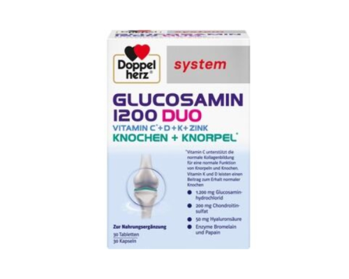 Doppelherz 系統 GLUCOSAMINE 1200 DUO 含有維生素 C、維生素 D、維生素 K 以及微量元素鋅、銅、錳和硒。它還含有 1200 毫克鹽酸葡萄糖胺、200 毫克硫酸軟骨素、50 毫克透明質酸以及鳳梨蛋白酶和木瓜蛋白酶。